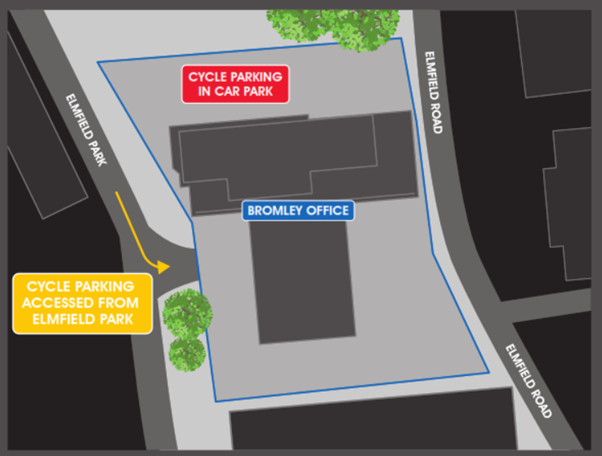 Cycle parking within the Bromley site is located within the basement car park, here there are also lockers. Access to the internal cycle storage is gained from Elmfield Park to the rear of the building.