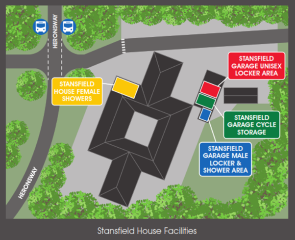 The cycle parking is located within the Stansfield Garage to the rear of Stansfield House. This is an internal bike store so please register as a cyclist at [email protected] to gain access to the cycle storage. A unisex locker area is located adjacent to the cycle storage area. The male shower area adjoins the cycle storage area within Stansfield Garage. The female shower area is located within the main Stansfield House building next to the ground floor accessible toilet.